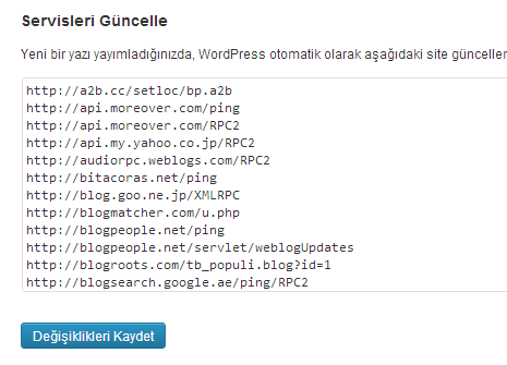 İlk olarak yapmanız gereken aşağıda vereceğim linke tıklayarak wordpress ping listesini kopyalayınız. Daha sonra wordpress admin panelinize giriş yaparak “Ayarlar” bölümü altında bulunan “Yazma” bölümüne tıklayınız.En aşağıda bulunan “Servisleri Güncelle” bölümünde ki boşluğa verdiğim listedeki siteleri kopyala yapıştır yapıp kaydediniz.